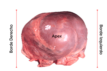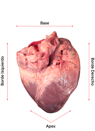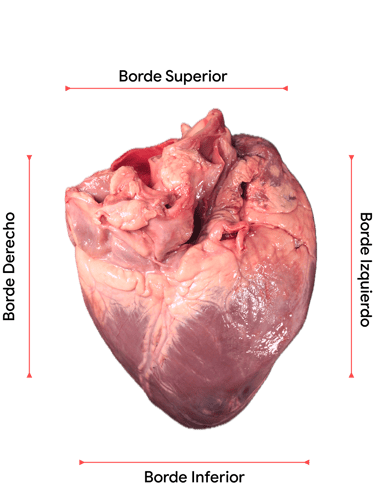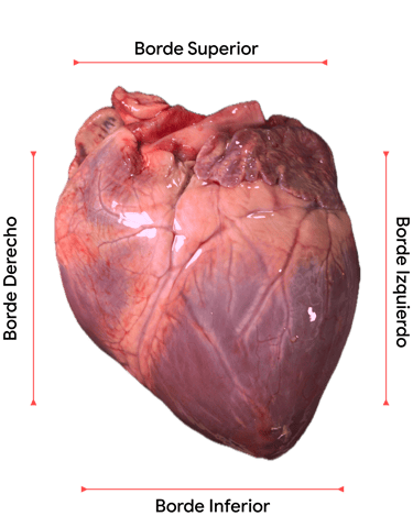 como las aurículas, ventrículos, estructuras principales y la orientación anatómica general.