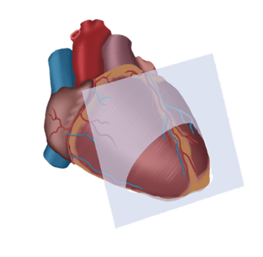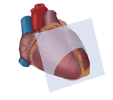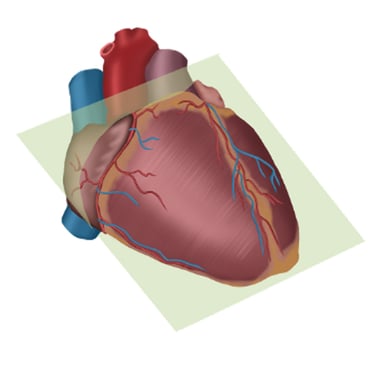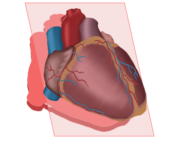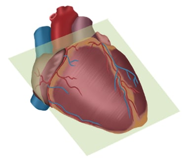 Plano horizontal, atravesando el corazón de un lado a otro, generalmente desde la parte superior del corazón hacia la parte inferior, permite observar la relación de las cavidades auriculares con los ventrículos y los vasos principales, como la aorta y la arteria pulmonar.