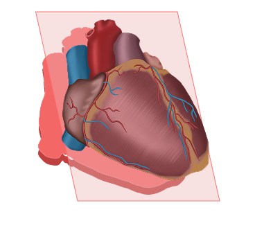Plano frontal o vertical, dividiendo la estructura en una parte anterior y una parte posterior. Permite estudiar la relación entre las estructuras anatómicas en su conjunto, y permite observar cómo los ventrículos derecho e izquierdo se distribuyen a través del eje medio del corazón.